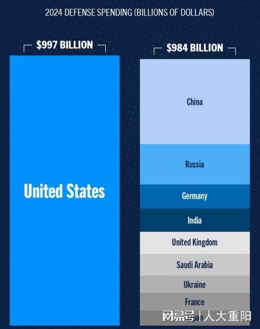 美国军费开支是排名其后的九个国家之和。2024年达到9970亿美元 美国彼得森基金会