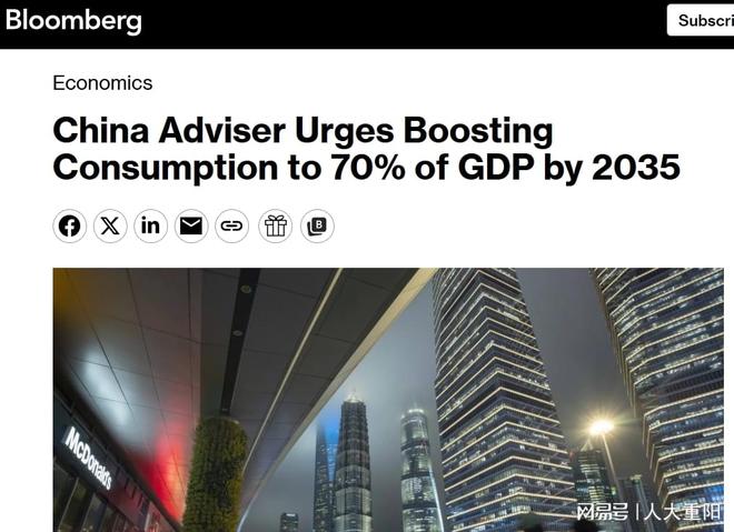 彭博社采访的专家呼吁:中国将消费占GDP比例到2035年提高到70% 彭博社 报道截图
